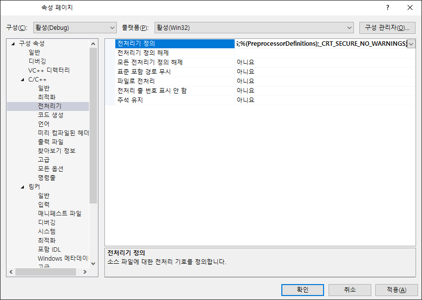 _CRT_SECURE_NO_WARNINGS 발생시